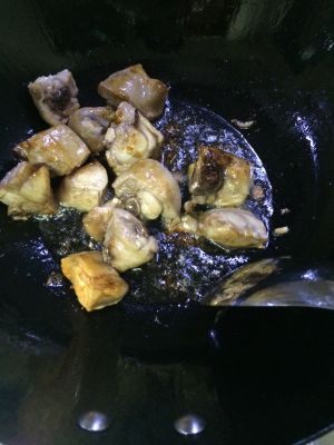 待冰糖化开出现棕黄色,加入鸡腿、翅中块翻炒,至水汽收干。