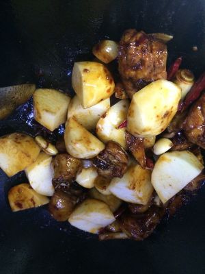 加入开水,没过鸡肉和土豆,中火慢慢炖收汤汁。