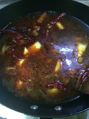 3、炝香 花椒粒、辣椒皮、八角、草果、姜片、蒜瓣同时倒入锅中大火炝香,加土豆块、适量盐、两勺海鲜酱油或调味生抽,翻炒均匀