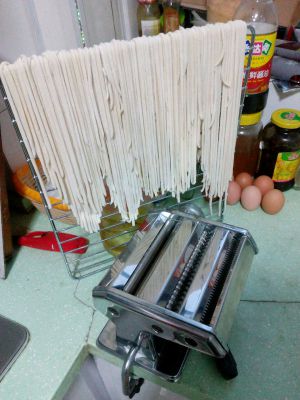 和面。取50g面粉慢慢加水,揉成面团,醒15~20分钟,面团揉光幹成薄片,折叠,然后用刀切成面条,注意要多加干面粉,防止粘连