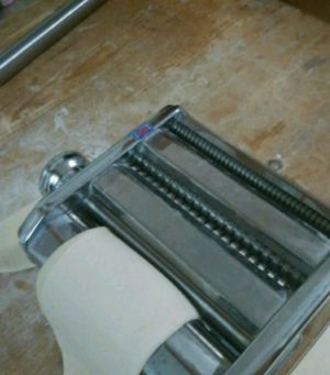 把面团分成一块块的,再杆成扁扁饼状,用面条机4档(共6档)压匀。