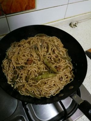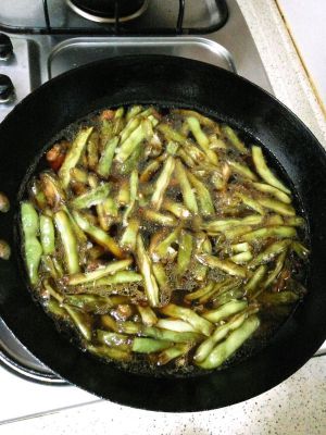 热锅凉油,下腌好的肉煸炒,再放入焯好的扁豆,放一点老抽提色