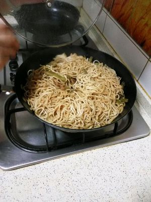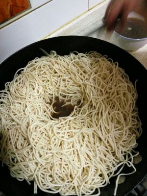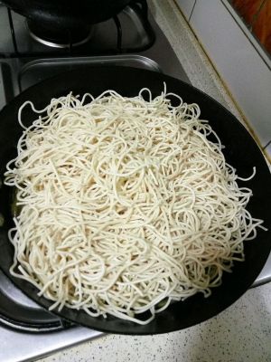 这个时候可以把火调小,然后开始用油抓面条,面条要买细切面