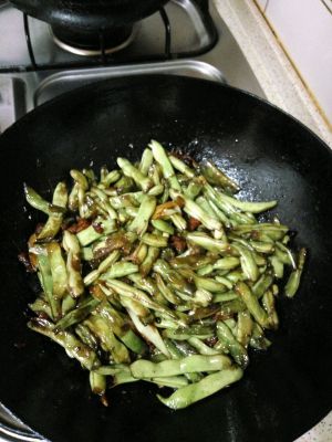 蒜煸炒出香味后,倒入扁豆,不停翻炒