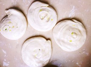 另取一个碗放入面粉加入食盐,五香粉,胡椒粉,锅内热油浇在面粉上制成油酥,迅速搅拌开,放入葱花再放一些热油炸香葱花搅拌均匀,葱油酥就做好了。接着取出醒好的面团分成等份