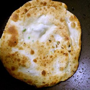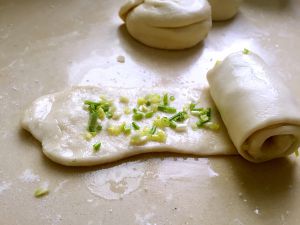 两面抹油 撒上葱花和细盐 注意盐的用量 也可以把盐直接和放葱花里调好