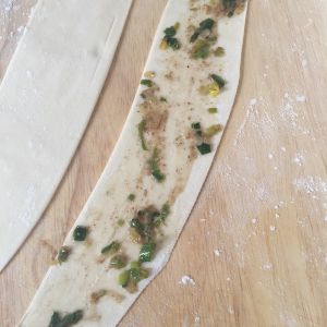 杆面皮,把葱末和油均匀撒在面皮上,然后卷起来用擀面杖杆几下,千万记得放盐!!!哈哈哈哈