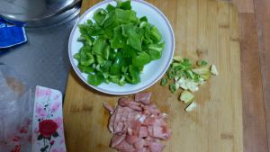 青椒洗净撕块,肉切片,葱花、蒜末、姜切片备用。