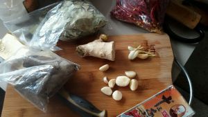 配料提前准备好,不然烧制的时候会手忙脚乱的,生姜切丝,蒜头切碎,自家的葱头,香叶三片,肉桂一片,干辣椒2个,泡椒一个,家里有个娃,没弄那么辣,可以根据自己喜好,我是把家里的所有配料都找过来了
