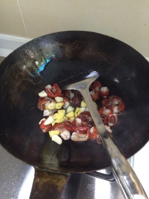 锅内放食用油,倒入龙虾,翻炒至泛红,然后放入姜蒜,继续翻炒,直至完全变红。