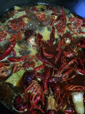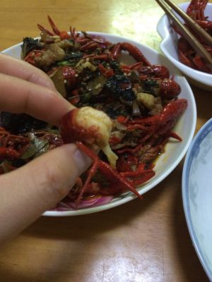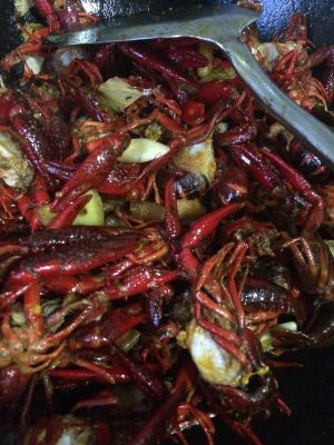 热锅冷油,下豆瓣酱,小火炒出红油,放几颗冰糖炒化,放入龙虾,转大火翻炒,放入姜蒜、五花肉,香料,两分钟后放入一大勺料酒,加盐、老抽。