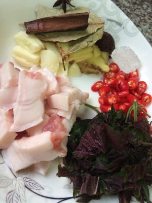 准备好配料:姜蒜切片,香料冲洗一下,五花肉切厚片,朝天椒、紫苏切小段。