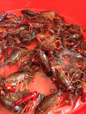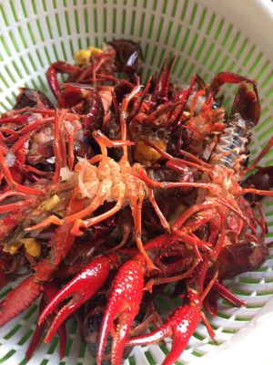 捉了这么多小龙虾,晚上放大盆中没过龙虾身子高的水,倒少量盐和香油让它们吐出脏东西,第二天倒掉水,开始剥头,用牙刷洗肚子