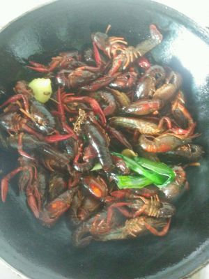 待豆瓣香味出来后,加入点鸡精,烹一点料酒,然后在锅内加入锅中虾子3分之1的水煮开