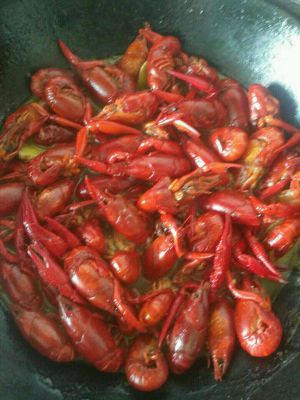 辣椒花椒香味出来后,倒入虾子翻炒,建议可加入一块猪油炒,味道更香腻,(一般全身红透即可为熟)