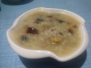 切忌:先放肉熬出肉香,再放入皮蛋喔