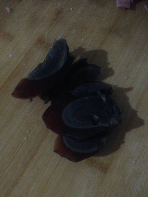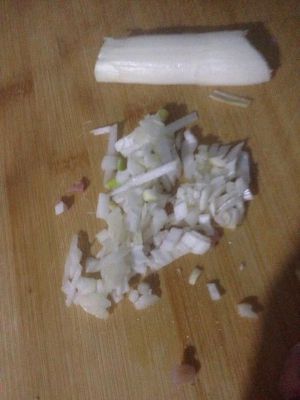 用一小块肉切成肉丝,把皮蛋切成丁(皮蛋数量根据自己喜爱。)再切点姜末备用。