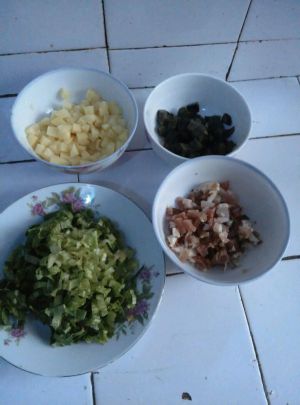 把这些材料切丁,锅里放油,油热了把肉皮蛋土豆放入锅里炒熟。放入熬粥的锅里熬。等快熬好了的时后,再把青菜放入锅里,再熬10分钟。
