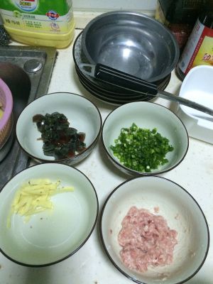 姜片切丝,皮蛋切碎,肉切丝或丁备用。