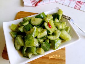 将辣椒段、葱花在热油中炼香,淋在黄瓜段上即可