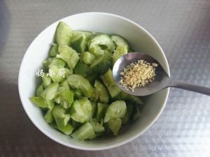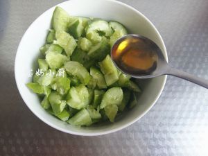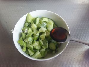将糖、陈醋、蒸鱼豉油、芝麻油、盐、姜蒜加入黄瓜段中,混合均匀