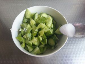 将拍裂的黄瓜切段,用盐腌制5分钟,将腌出来的汁倒掉