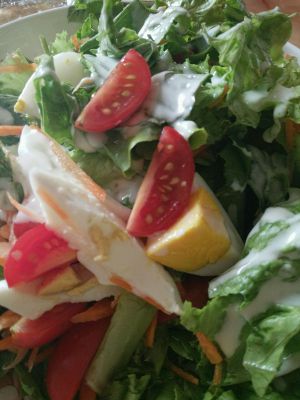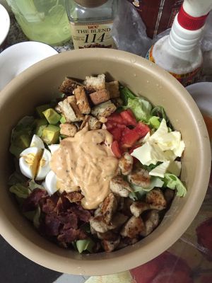 我还烤了一块面包然后切丁,白煮蛋切丁,把所有切丁的食材放在蔬菜上,然后淋上千岛酱,就算完成了!除了面包之外的都是考伯色拉的基本配置,蔬菜则是随意,培根、鸡肉、鸡蛋、芝士和牛油果则建议不要省略!色拉酱用千岛比较和谐,别的也可以!