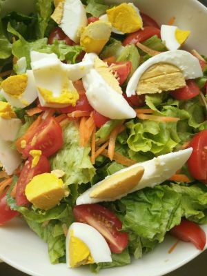 把菜清洗干净,生菜和苦菊菜撕小,圣女果切半,胡萝卜切丝,再把煮熟的白水蛋切成小块