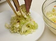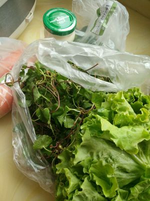 洗干净切开的蔬菜打底,这一次我用了甘蓝、生菜和芝麻叶,照片不是这一次的,多了黄瓜和小番茄
