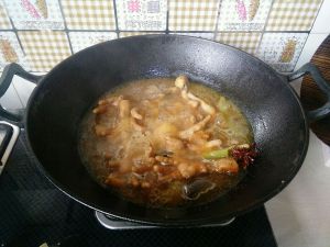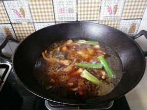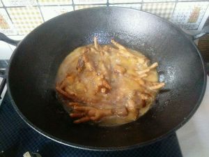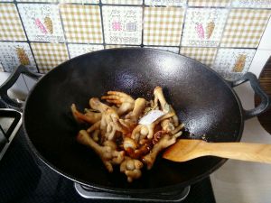 冰糖融化成琥珀色泽,就倒入鸡爪,快速翻炒后倒入备好的香料,来一勺料酒爆香。