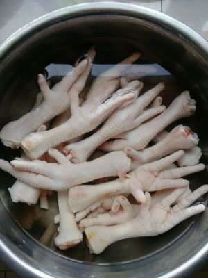 反复用清水浸泡鸡爪,清除一部分血水。