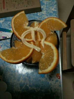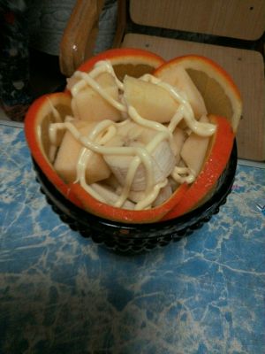 橙子横向切开,切成圆片再对半切,作围边。剩下所有水果切丁入杯,半圆橙片放上照型,挤上色拉酱。