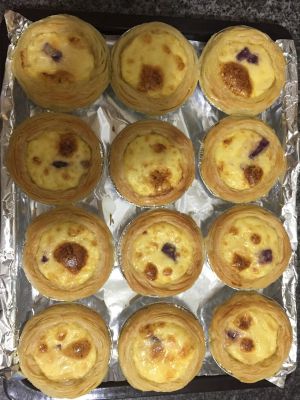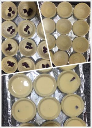 在蛋挞皮里先后放入蒸好的紫薯和蛋挞液。