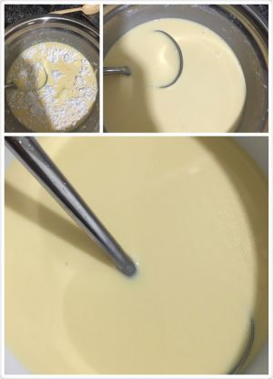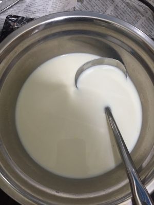 把牛奶、淡奶油,白砂糖倒在一起,搅匀,微火把白砂糖融化。