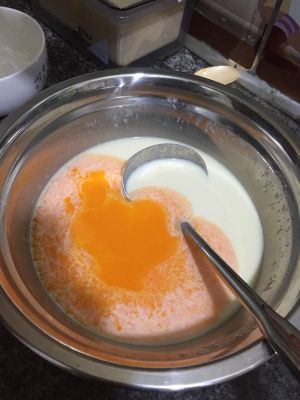2个鸡蛋,200ml牛奶和20g白糖放入碗中搅散。