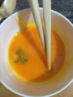 搅拌蛋黄,请注意,蛋黄里面的黑色物体是一小块姜,放入姜搅匀以后就扔掉,这样做的目的是就算蛋挞冷了也不会腥。