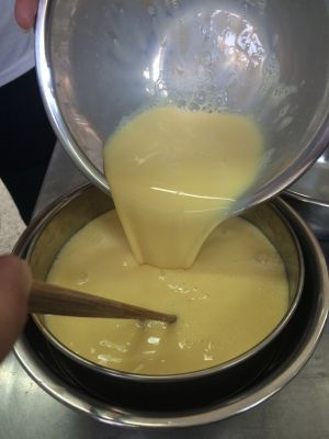 蛋挞水过滤网两次,滤掉未残留的蛋液等,保证蛋挞光滑。