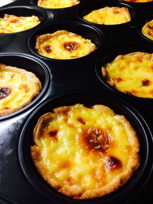 在烤至15分钟左右,一定要在烤箱旁仔细观察蛋挞的成色,看见蛋挞液出现焦糖色就可以关掉烤箱,以免烤糊!