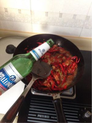 倒入龙虾,翻炒,淋料酒,倒入啤酒,加糖和盐,再加点水,煮熟龙虾。