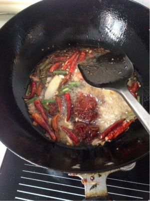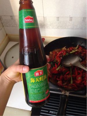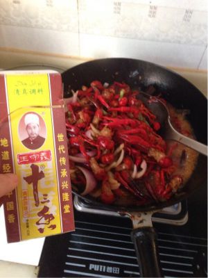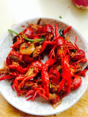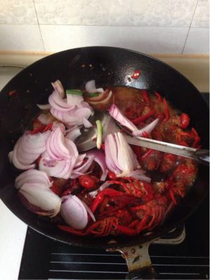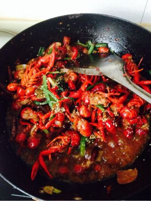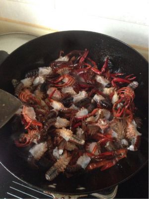 锅里放油,烧至8成热,放入蒜片、姜片、葱节、大料翻炒,在加入辣椒段,花椒粒翻炒,香味飘出后导入小龙虾继续翻炒,陆续加入老抽、白糖少许,炒两分钟加入清水,加盐、鸡精,翻一下,水位刚好差一点淹没小龙虾为宜。大火烧开后关中火慢慢炖,炖到水快收干时,关火起锅装盘(要留一部分汁待会儿吃肉时蘸)。