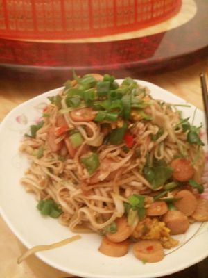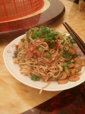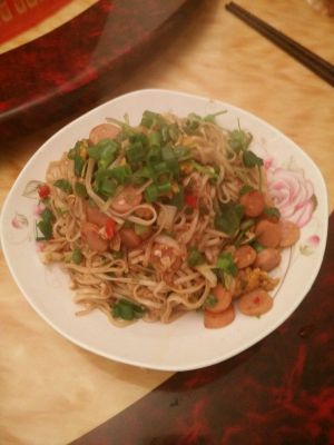 把火腿和配料切好,在锅中放猪油,再煎蛋搅碎,开小火依次放入辣椒、大蒜子、蒜、火腿肠、盐、味精、鸡精、耗油、酱油、辣椒油、辣椒酱、盐要少放些,调料太多怕会很咸,小火翻炒后开大火放入沥干的面用筷子翻炒至水份炒干,放入芝麻油、香菜稍微翻动盛盘撒上葱花!ok!