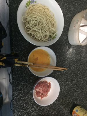 先将面条煮熟,捞起来备用,然后鸡蛋打好,肉丝用用酱油和料酒腌制一下,方便入味