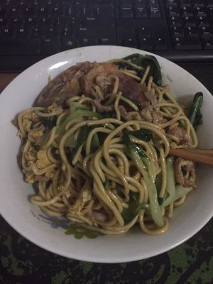青菜炒熟以后可以倒入面条翻炒,等一分钟后,倒入肉丝和鸡蛋…可以倒一点酱油入味,如果太淡,适量加盐,视情况而定!