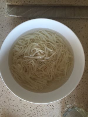 煮熟后,捞出放有凉水的碗中,一定要是凉水,一面面条黏在一起
