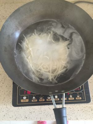 放入切好的青菜 豆腐干等 和肉丝一起炒 把青菜水分差不多烧干时加入面条