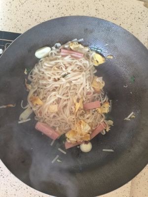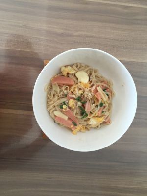 面条捞出放入锅中,加入生抽,盐和鸡精,加入鸡蛋和火腿,翻炒均匀后即可乘出