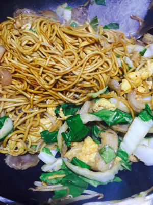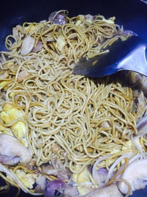 转中火下面条翻炒,下肉丝蛋花,加入老抽和生抽调色,翻炒均匀!