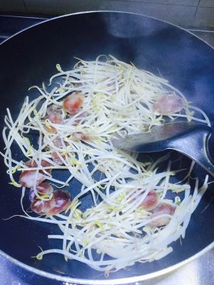 锅内放油,可稍多些后炒豆芽和香肠至变色!
