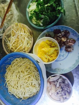 开水烧开,碱面煮开后冷开水冲透!肉丝,蛋花炒好备用,豆芽青菜洗净切好!香肠切好。