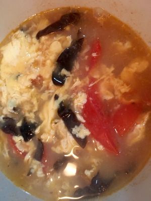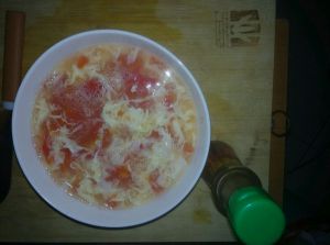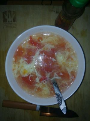 汤锅里倒水,放入西红柿,煮开,看汤色有点发红了,然后把汤勺把西红柿挤烂,嘿嘿,要小心烫喔,我觉得挤一下,汤里的西红柿味会更浓一下,时间久一点会更好,西红柿的营养全都进去汤里了,然后开始打蛋花,轻轻慢安慢的倒入汤锅里,先不要搅动,等蛋花差不多成型了,放入少许盐,搅动,淋入少许香菜,出锅!